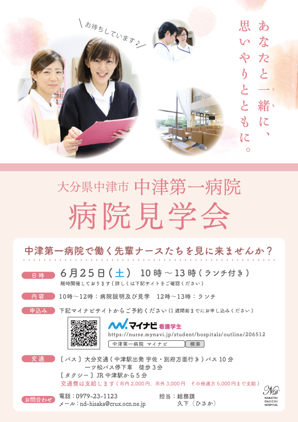 中津第一病院では看護師さん向けに病院見学会を開催しています。職場の雰囲気や働いている先輩ナースさんたちの姿を見に来られませんか。